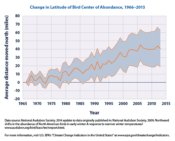Trends in the center of abundance moving northward can be closely related to increasing winter temperatures. This indicator is now used as one of the EPA’s Climate Change Indicators in the United States.